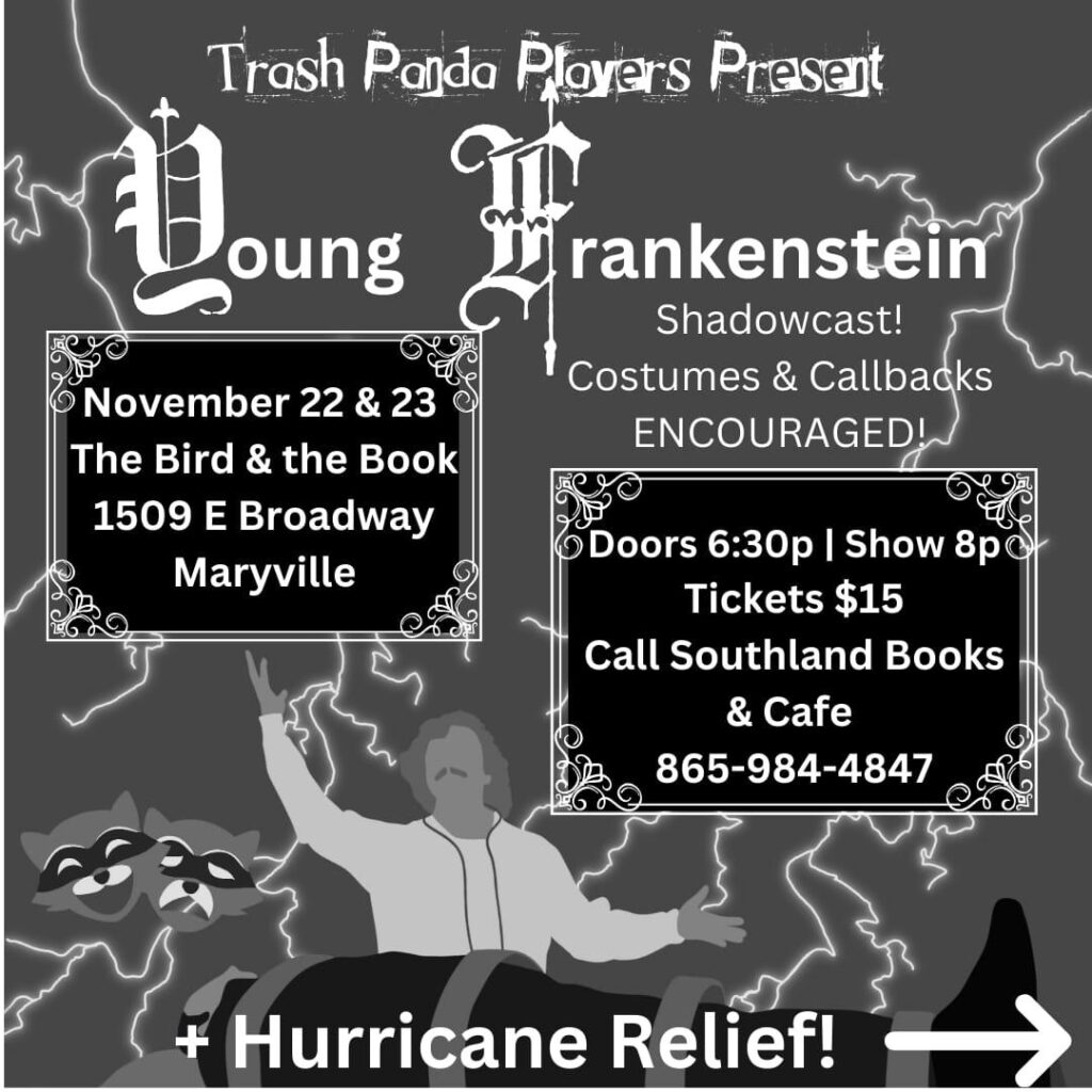 Come join us again for Young Frankenstein! We are still working to benefit grassroots efforts in Greene County for hurricane relief – so we will once again be offering our badges and additional door prize tickets! November 22 & 23, doors at 6:30 show at 8!