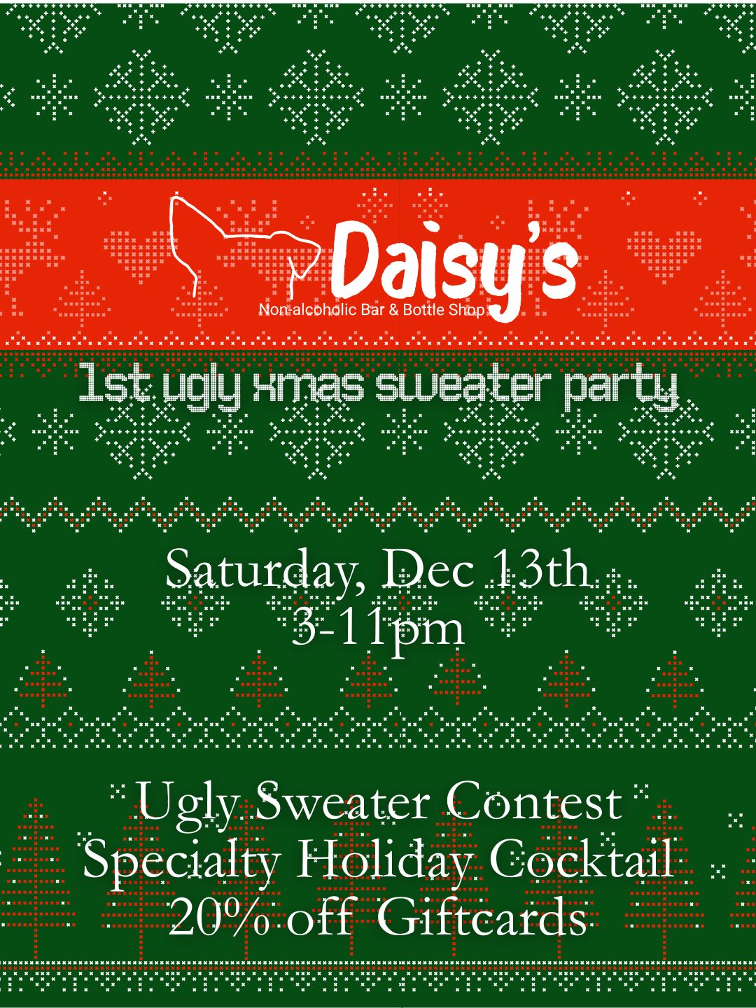 Daisy's Non-alcoholic Bar & Bottle ShopPull out your most outrageous holiday sweater and join us for a full day of festive fun: ๐ All Day Special Wear your ugly Christmas sweater and snag 20% off […]