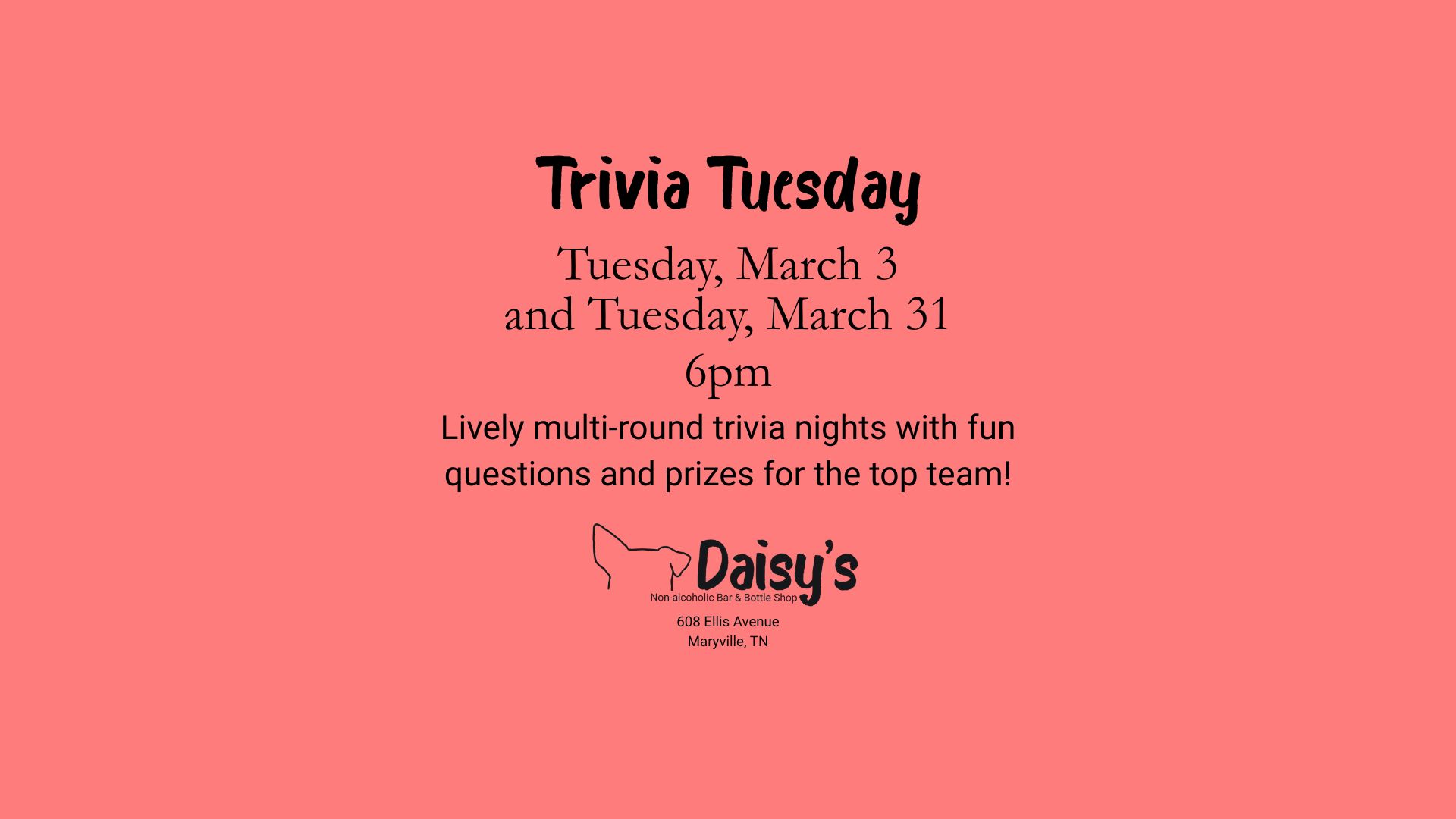 Daisy's Non-alcoholic Bar & Bottle ShopGather your cleverest friends for Trivia Tuesday, a multiโround game covering everything from pop culture to oddball facts. Teams compete for prizes and bragging rights. Teams come early to sign up. Questions begin right at 6pm.